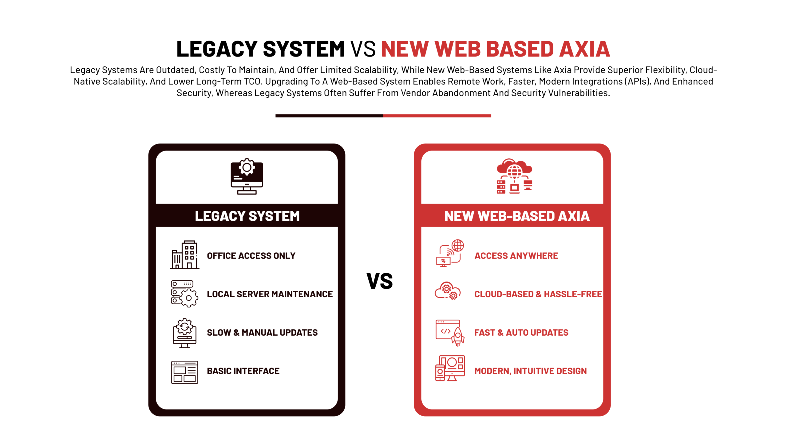 We’re upgrading Axia to a new web-based platform designed to make your work easier and more efficient. It’s faster, smoother, and more intuitive, so everyday tasks feel simple and seamless compared to the old system.