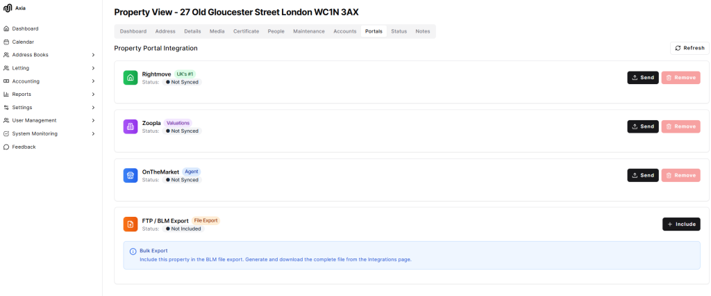 Connect properties directly to Rightmove, Zoopla, OnTheMarket, and export channels with ease.